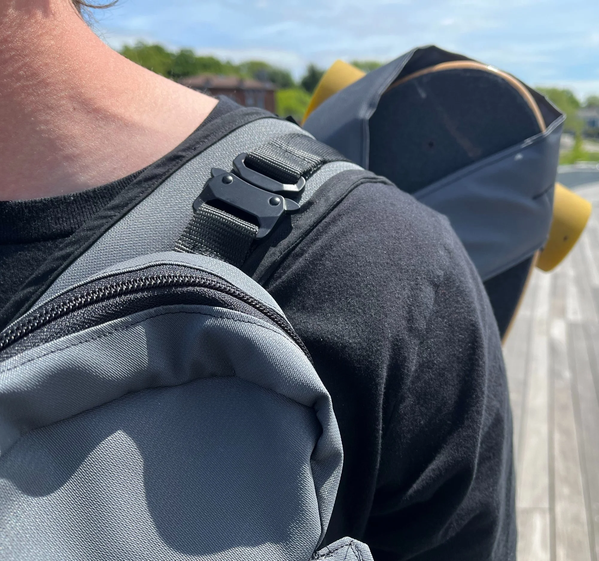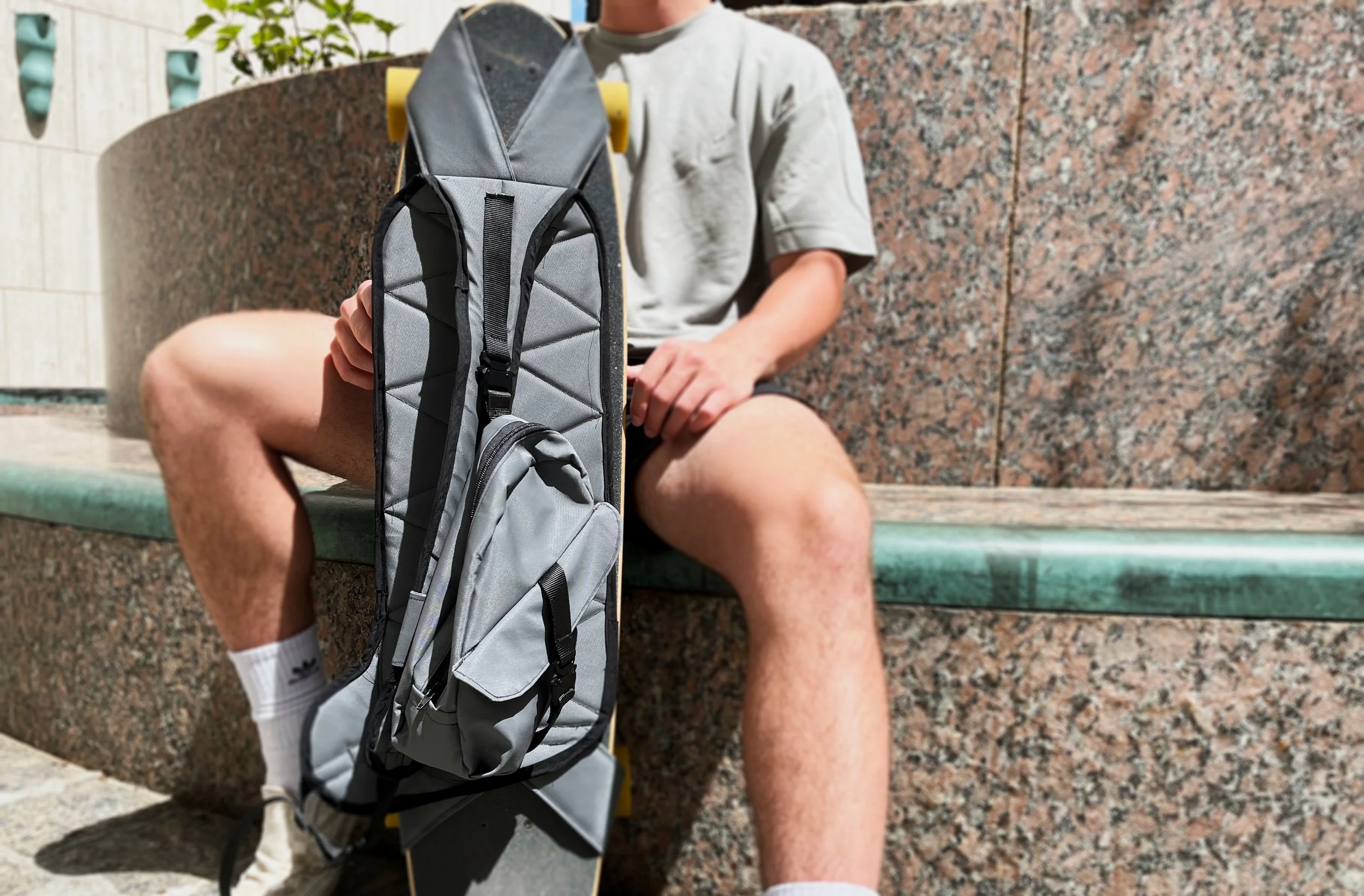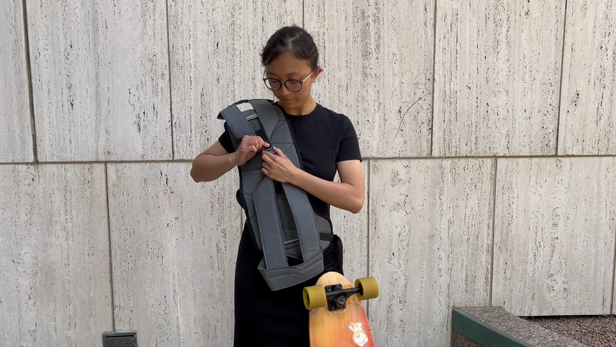 The main component of BoardBuddy is the carriage for the longboard located on the back of the user. The video demonstrates how the bag can be quickly attached and detached from the longboard