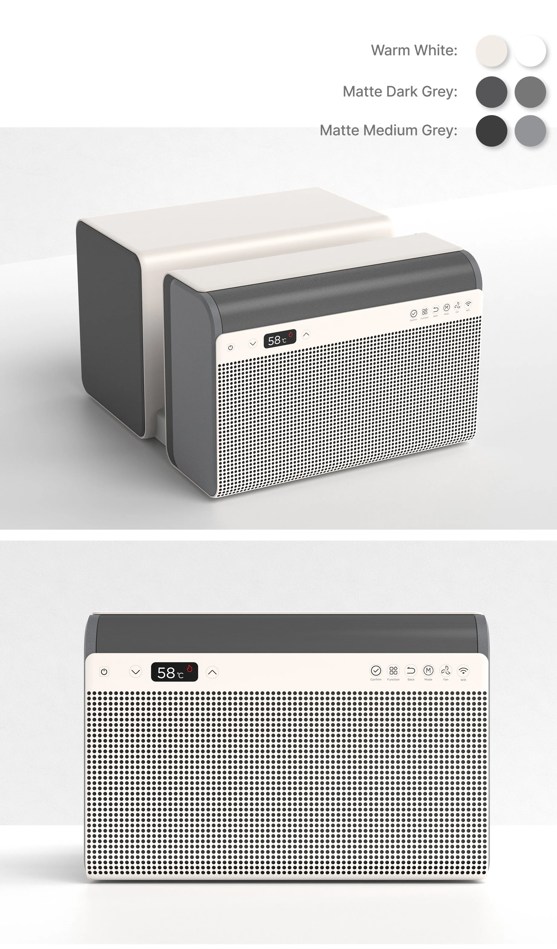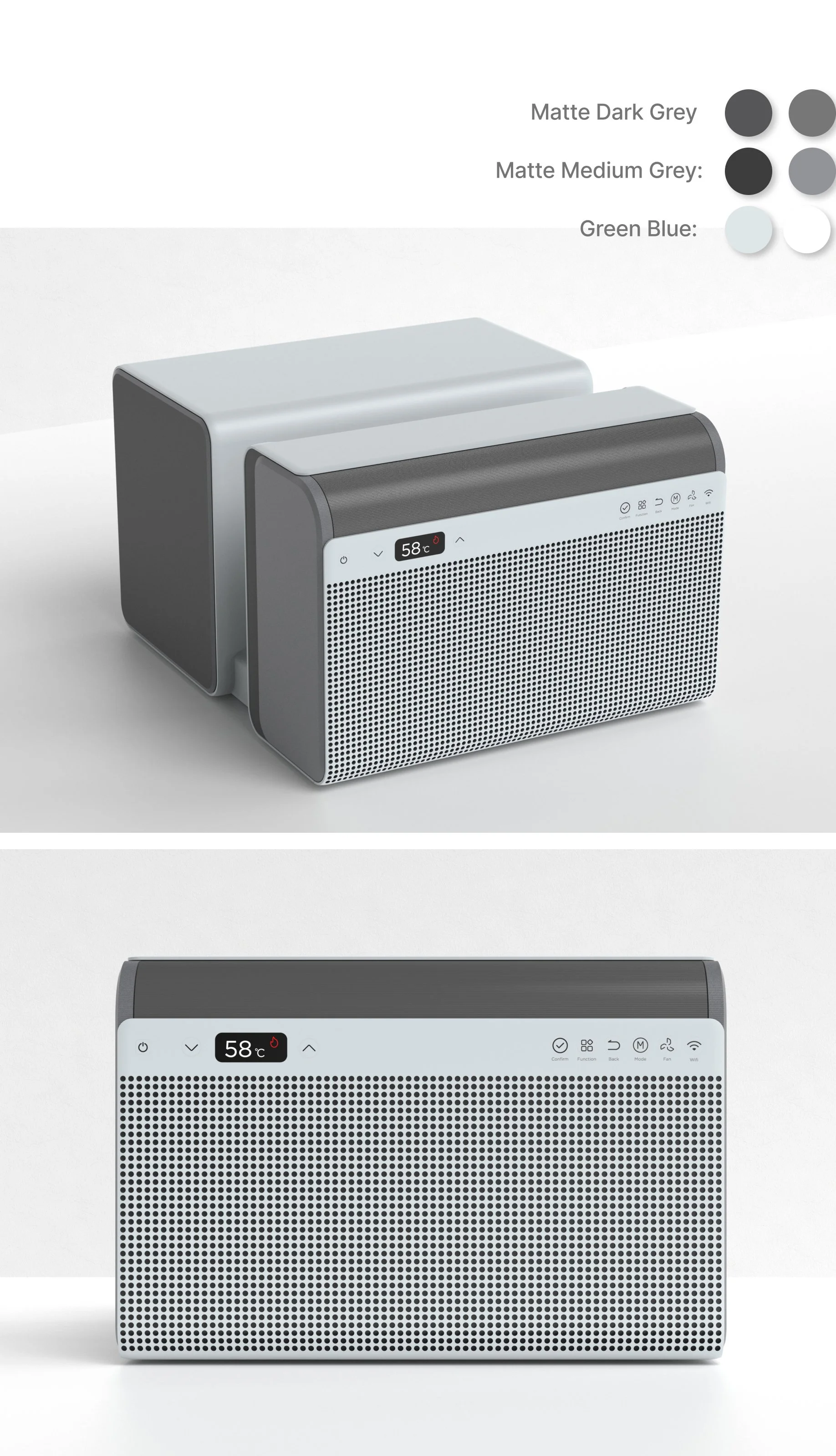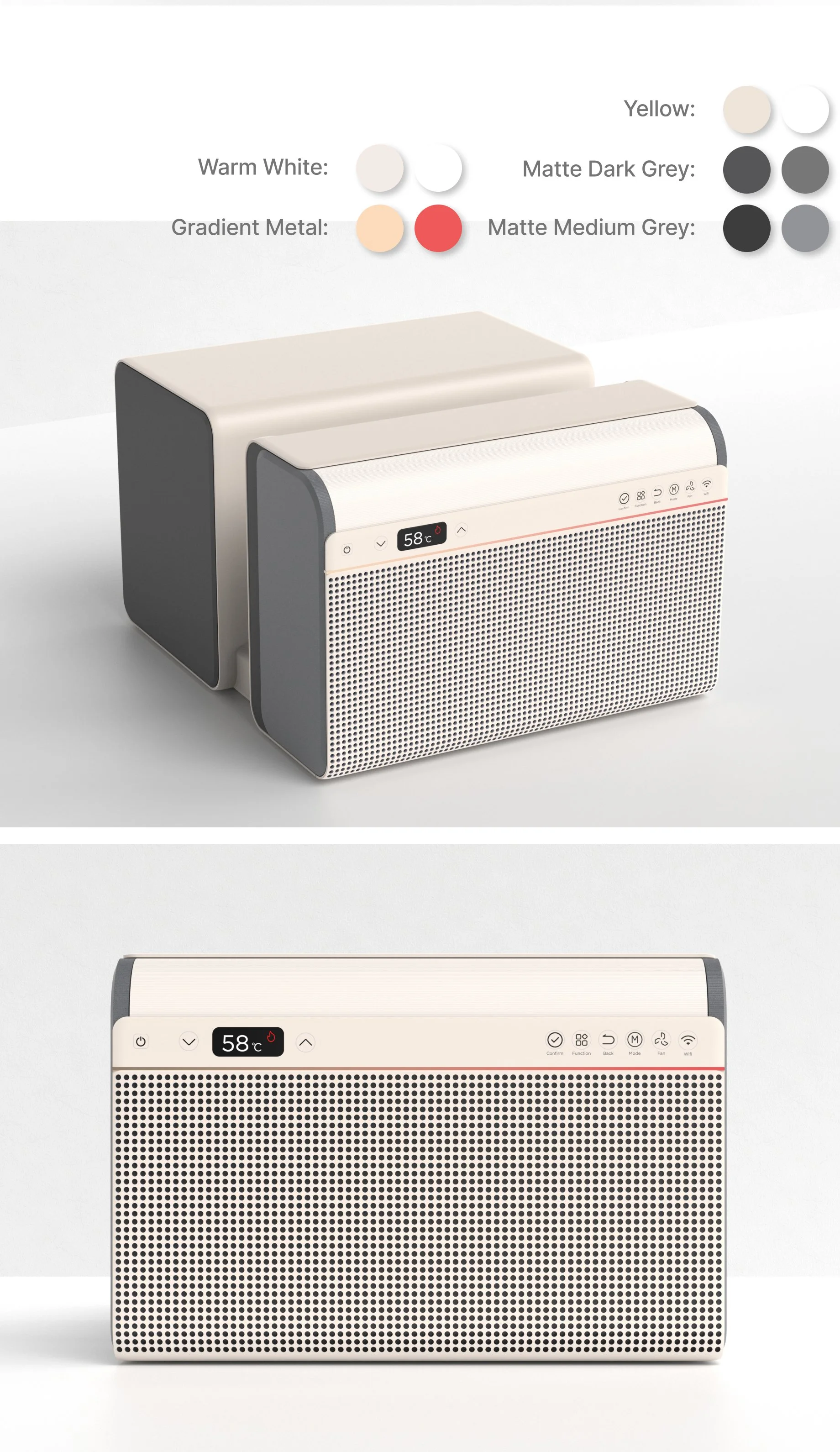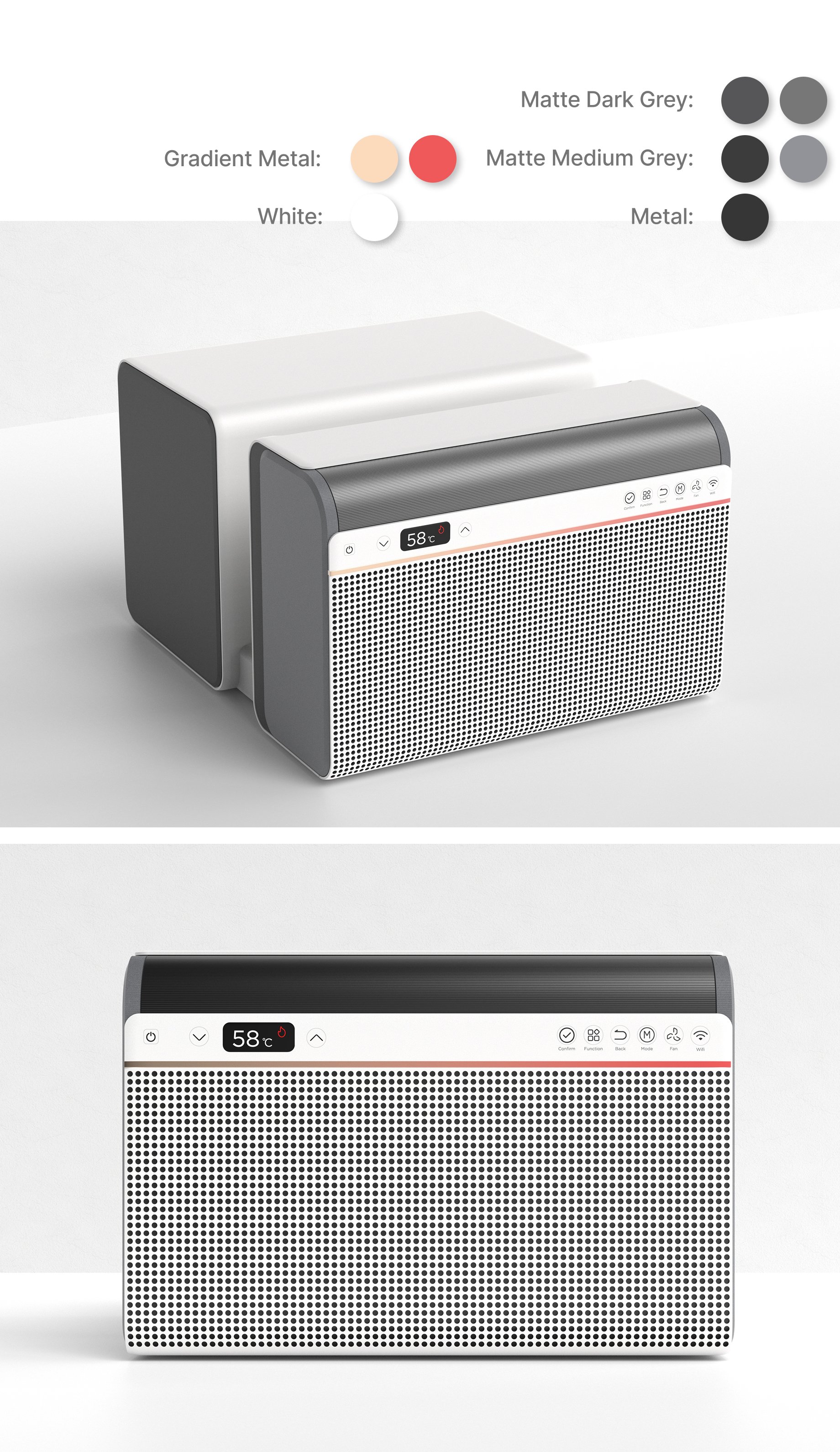 While evaluating multiple form concepts, I explored various ways to introduce contrast and differentiation through color and material configurations. This included investigating plastic-to-metal transitions, juxtapositions of glossy and textured surfaces, subtle versus high-contrast color pairings, and anodized color gradients. The study helped validate the effectiveness of CMF blocking in reducing the perceived visual footprint of the unit. It also pushed the boundaries of traditional air-conditioner CMF by demonstrating how color can create a younger, more modern product expression.