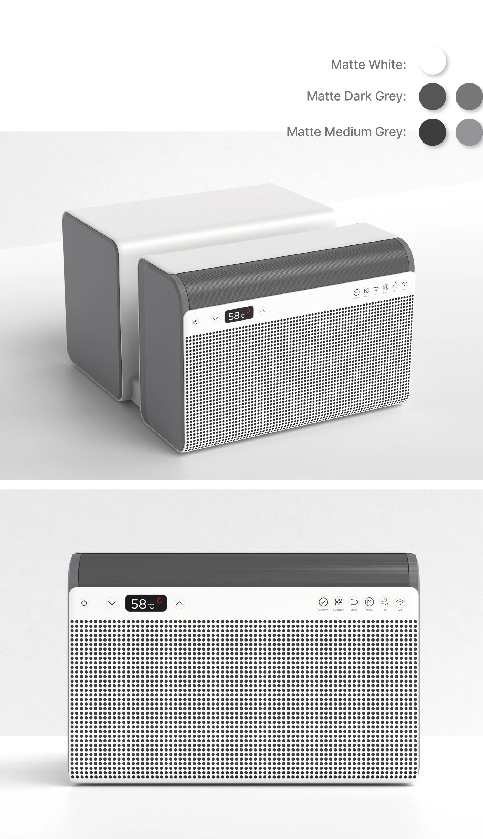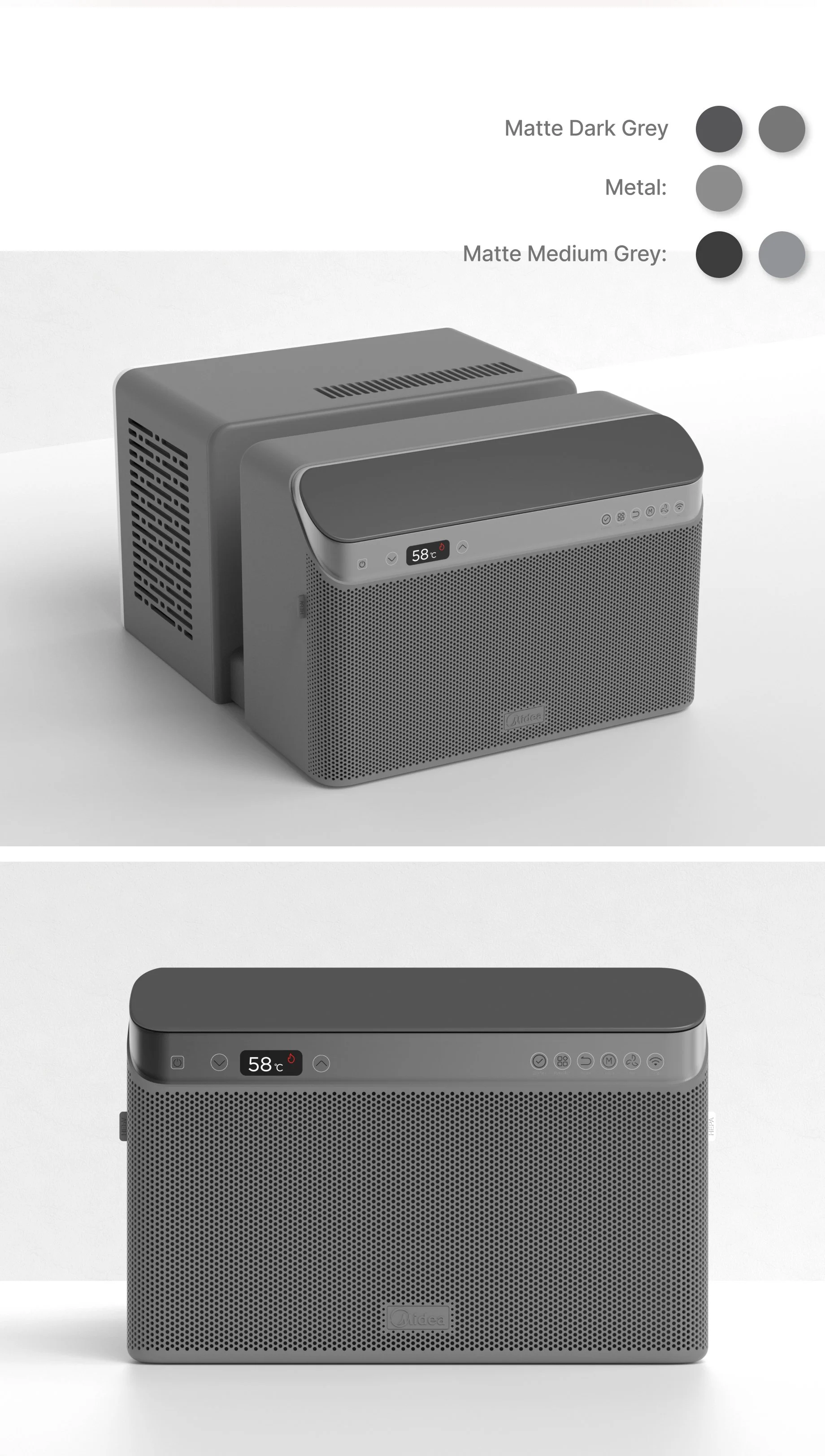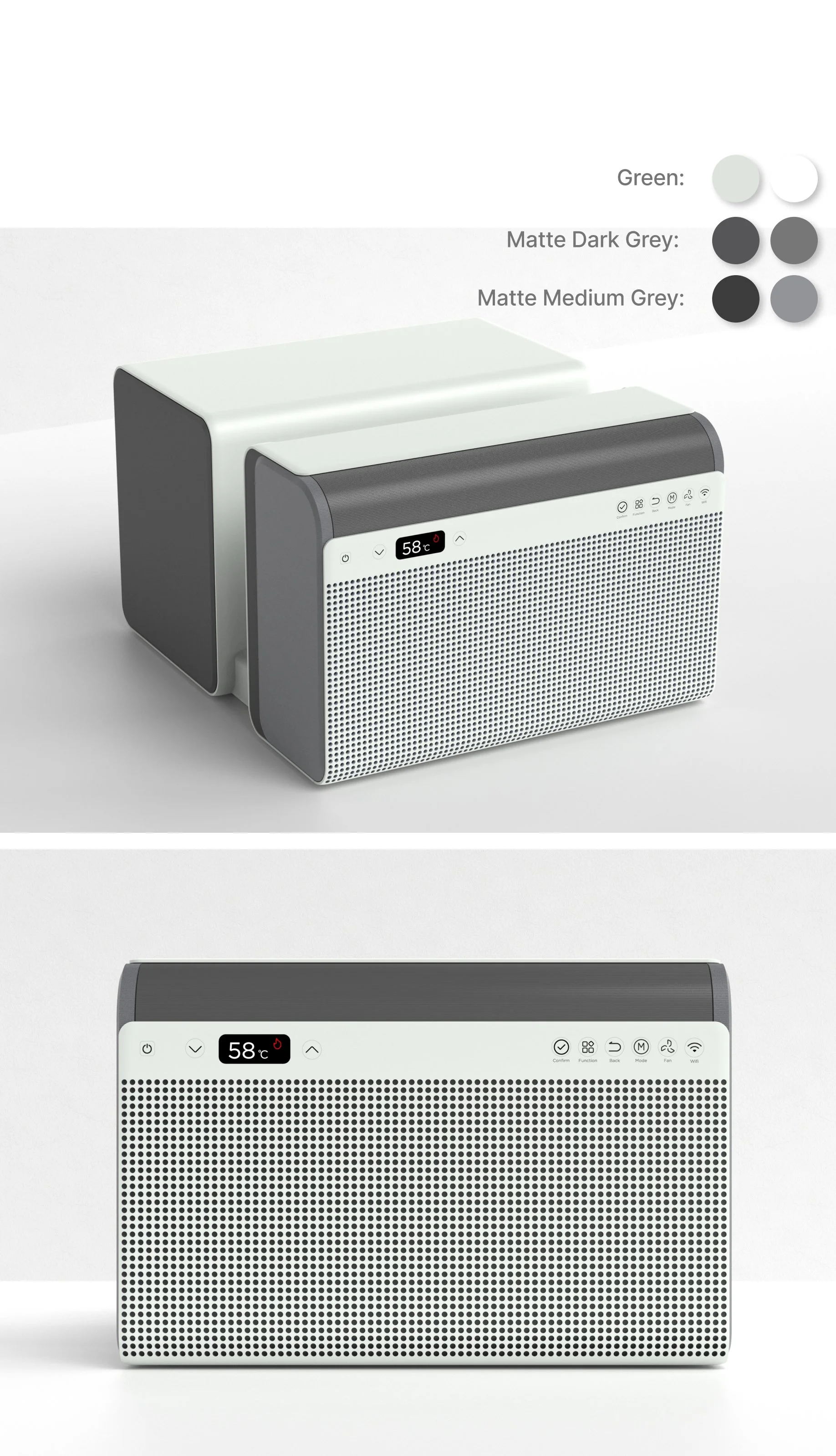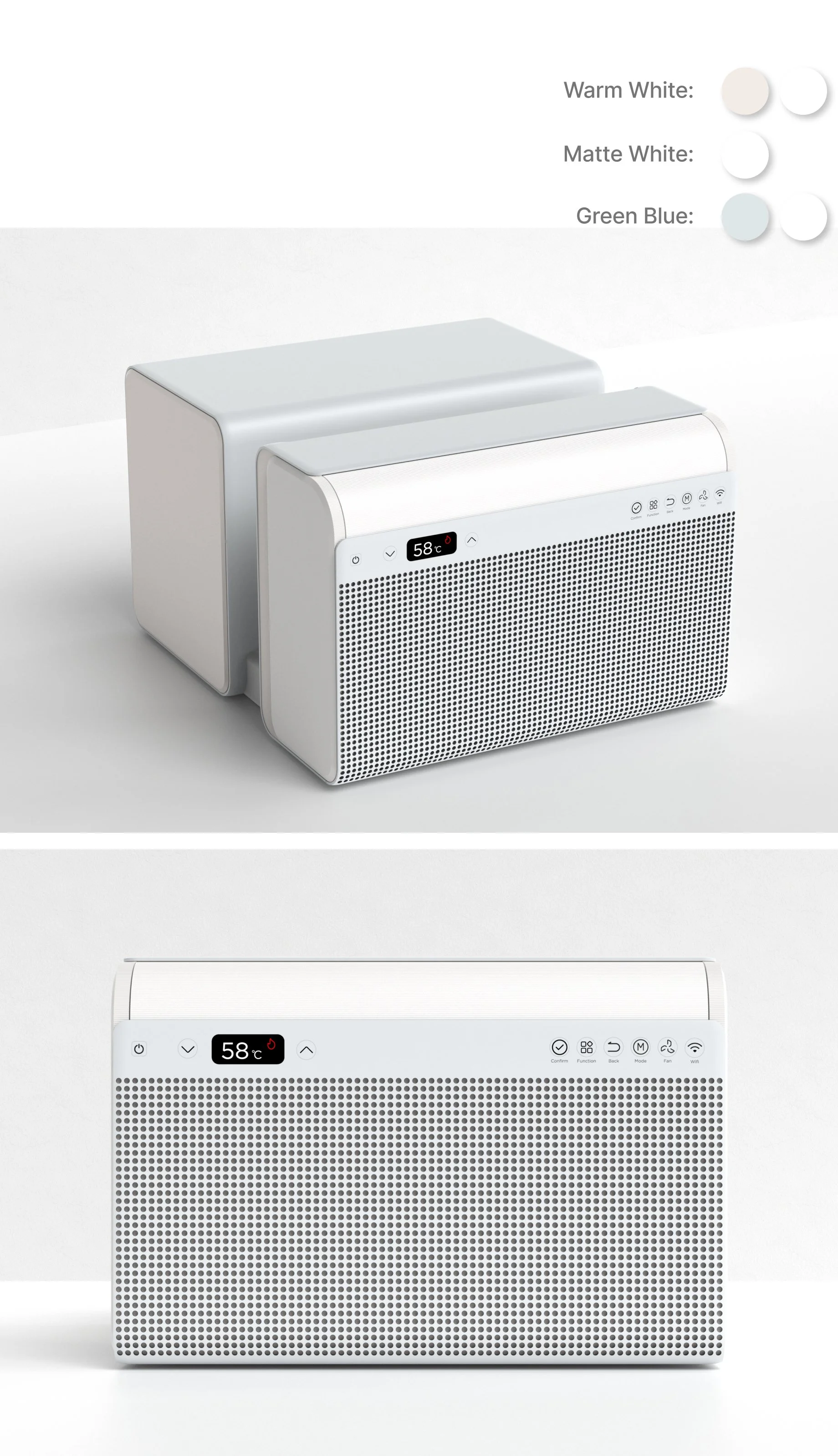 While evaluating multiple form concepts, I explored various ways to introduce contrast and differentiation through color and material configurations. This included investigating plastic-to-metal transitions, juxtapositions of glossy and textured surfaces, subtle versus high-contrast color pairings, and anodized color gradients. The study helped validate the effectiveness of CMF blocking in reducing the perceived visual footprint of the unit. It also pushed the boundaries of traditional air-conditioner CMF by demonstrating how color can create a younger, more modern product expression.