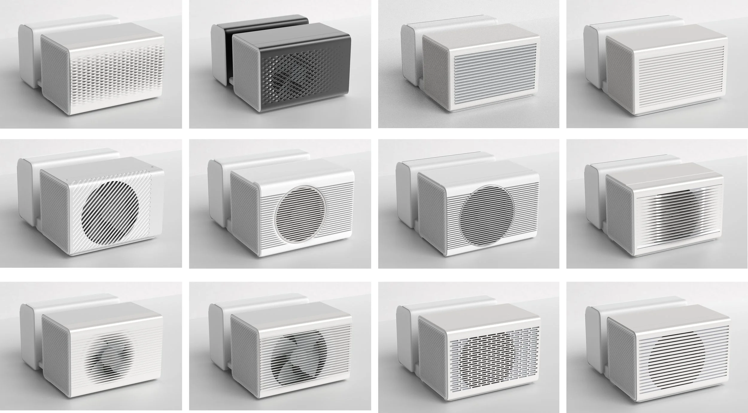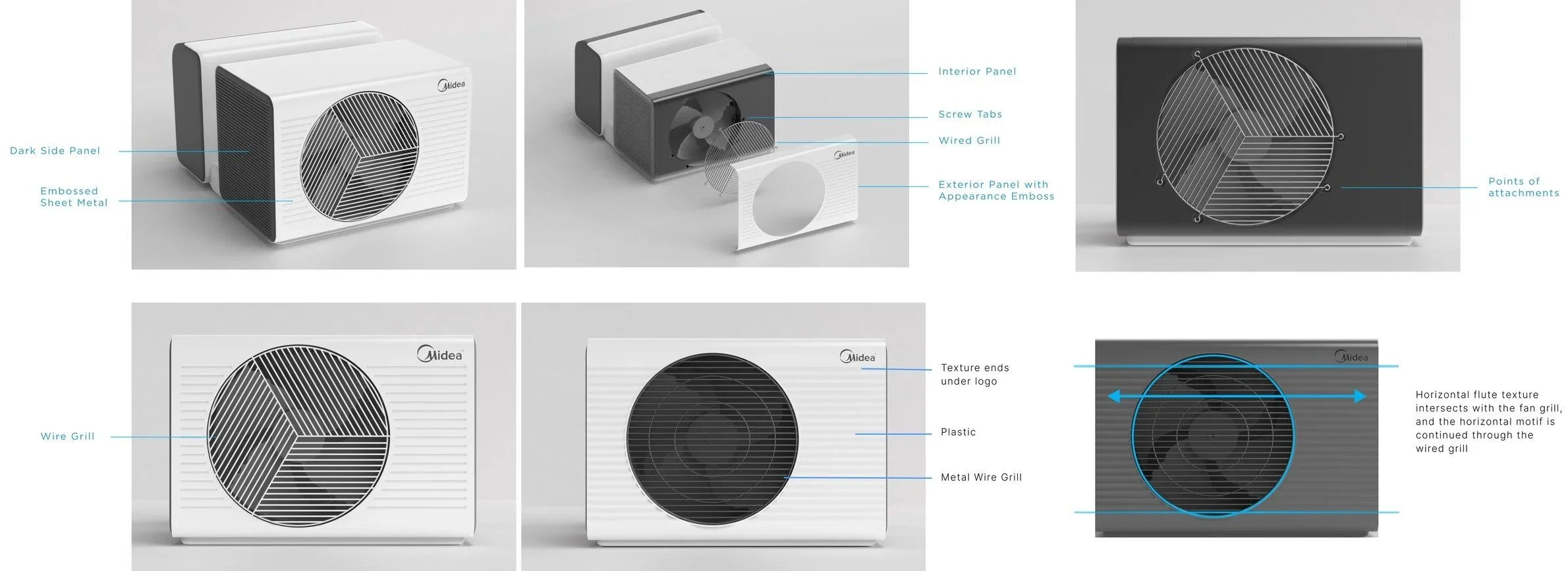 Ultimately, we went with the horizontal flue texture. Its composition echoed with PWHP (one of the prominent Midea heat pump products). The horizontal motif intersects with the circular grill and is continued through horizontal wiring pattern. However, later, the grill pattern was changed to circular spiral pattern due to ease of manufacturing.