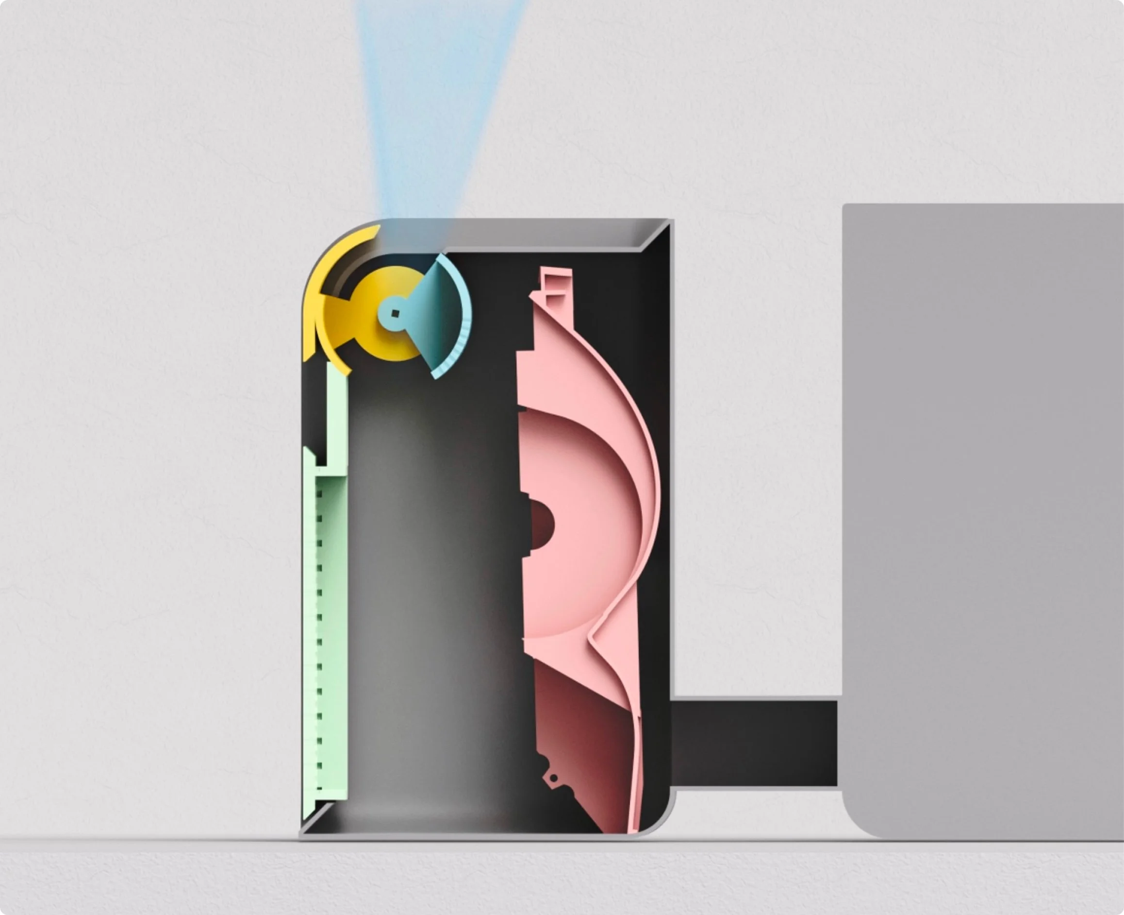 Leveraging the cylinder concept, I created a double layer louver system with a combination of solid louvers and breezeless louver (with density hole patterns). It utilizes two embedded motors on the left and right, depending on which one is activated, the unit has four different modes of air experience.