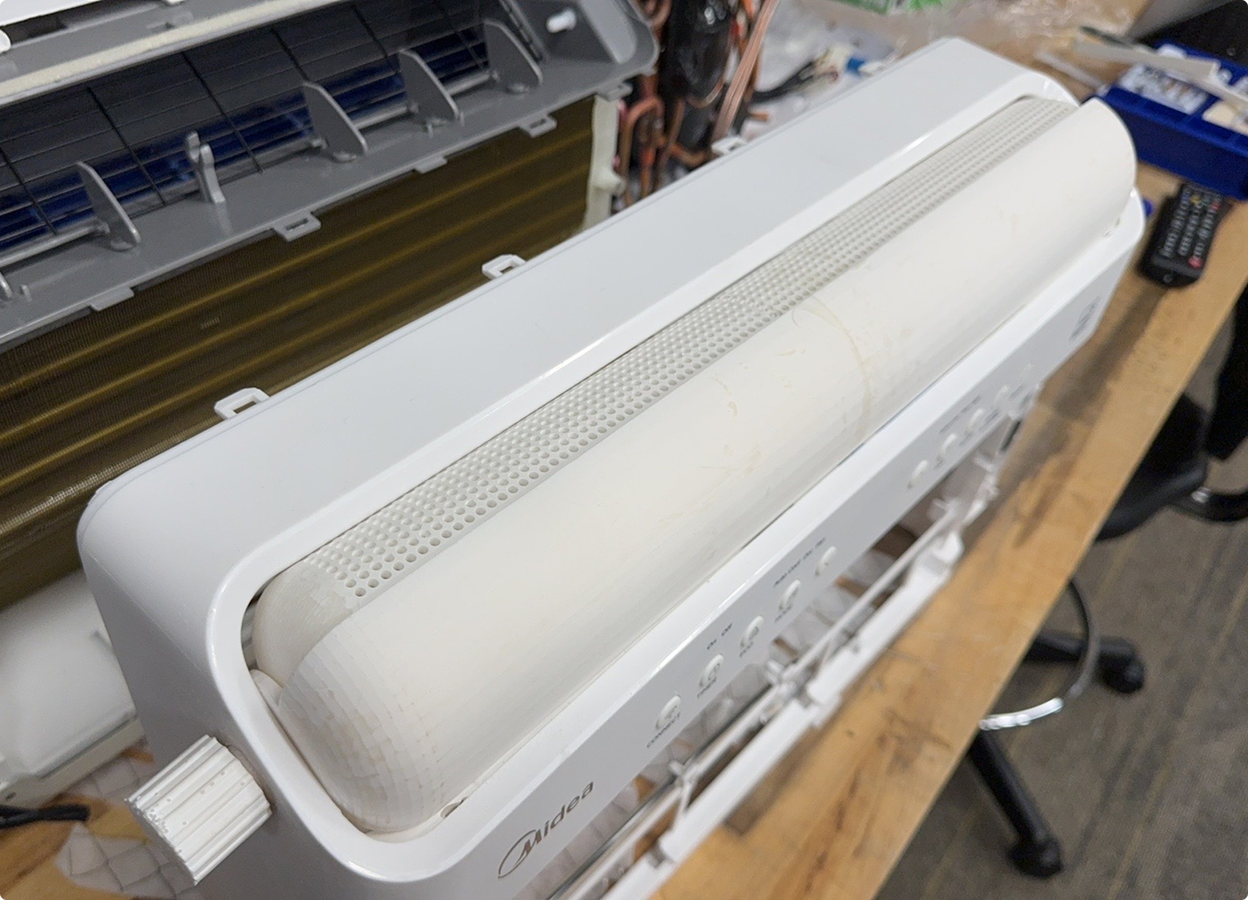 I installed the prototype on the first gen U-shaped window AC to test out the air flow. The louver can be manually controlled. This prototype effectively modulated the direction and strength of the airflow. This design was not implemented due to space constraints, however, it showed potential for a highly customizable air flow experience that was later considered for other platforms.