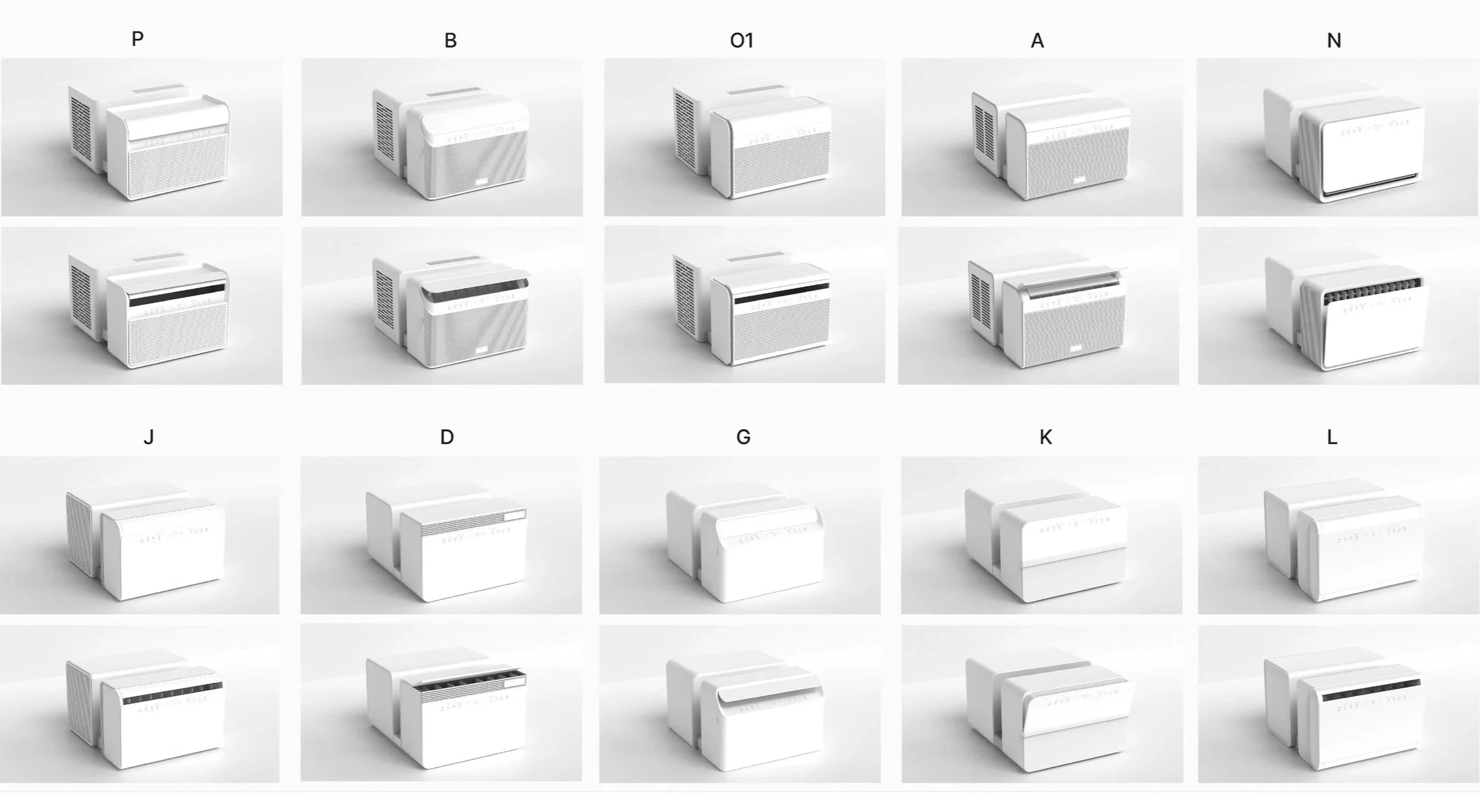 The overall form of the indoor unit is largely informed by the mechanical design of the air outlet and the placement of the user interface. I had several louver and UI concepts at my disposal. While assessing their feasibility, I conducted a MaxDiff study showcasing a series of isolated forms, air outlets (all rendered in plain white) and UI concepts. Separating these components allowed me to assess their visual impact in a controlled way. I learned which designs are more favorable, and which are more polarizing.