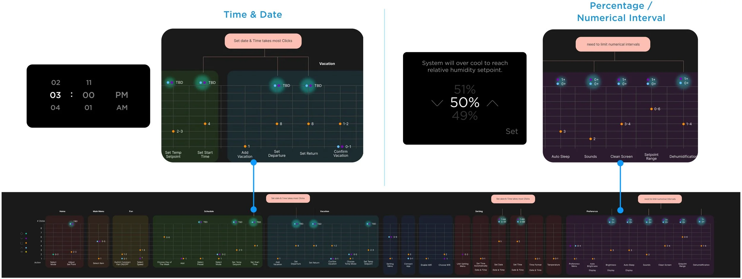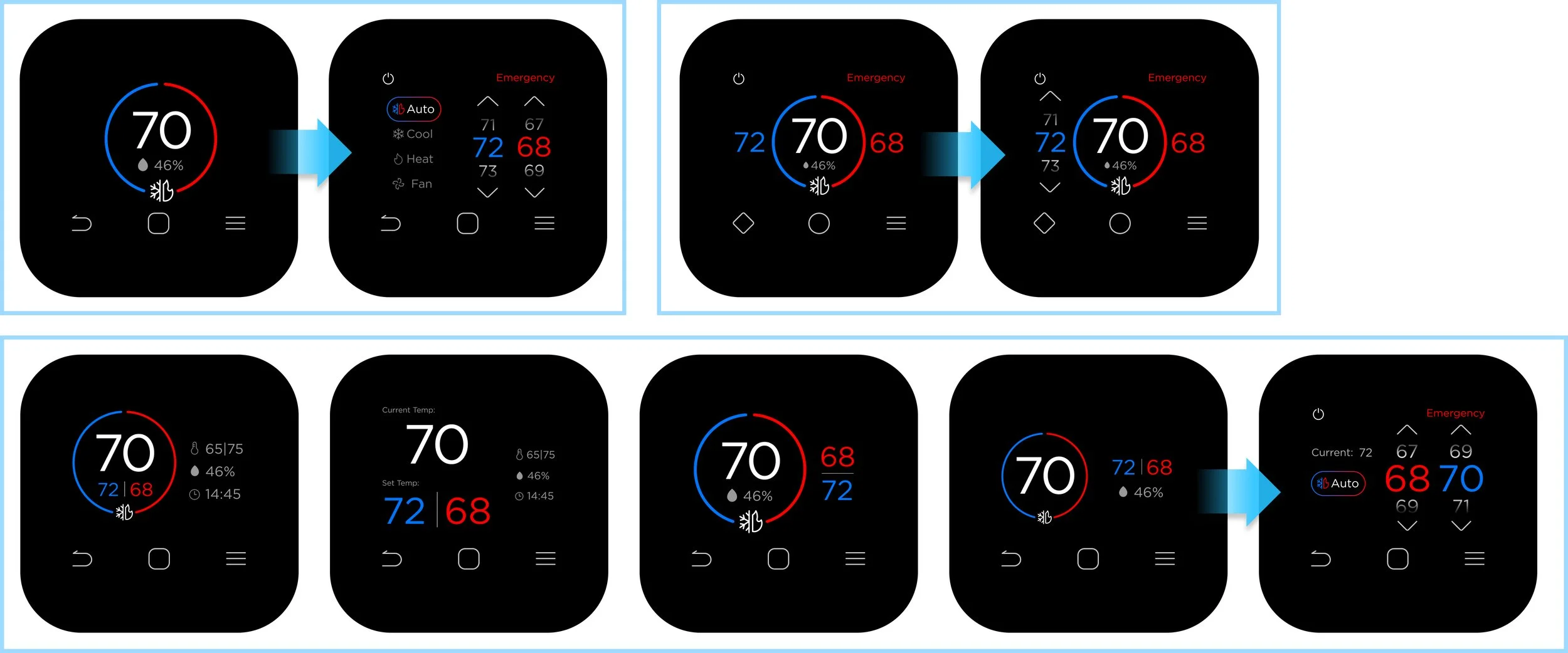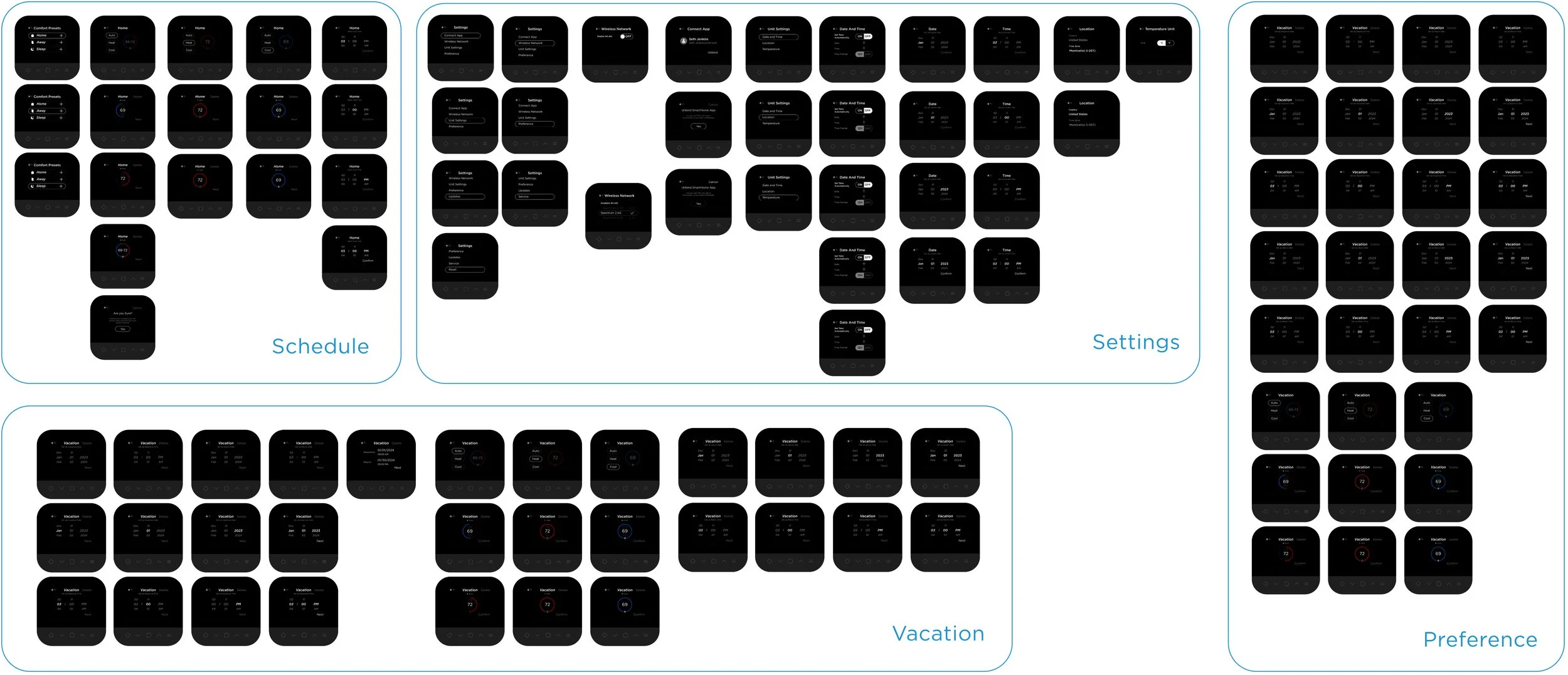 From high priority features such as temperature setpoints and modes to toggling through menu structures, I brainstormed different navigation logic that would accommodate all types of interactions needed in this thermostat.