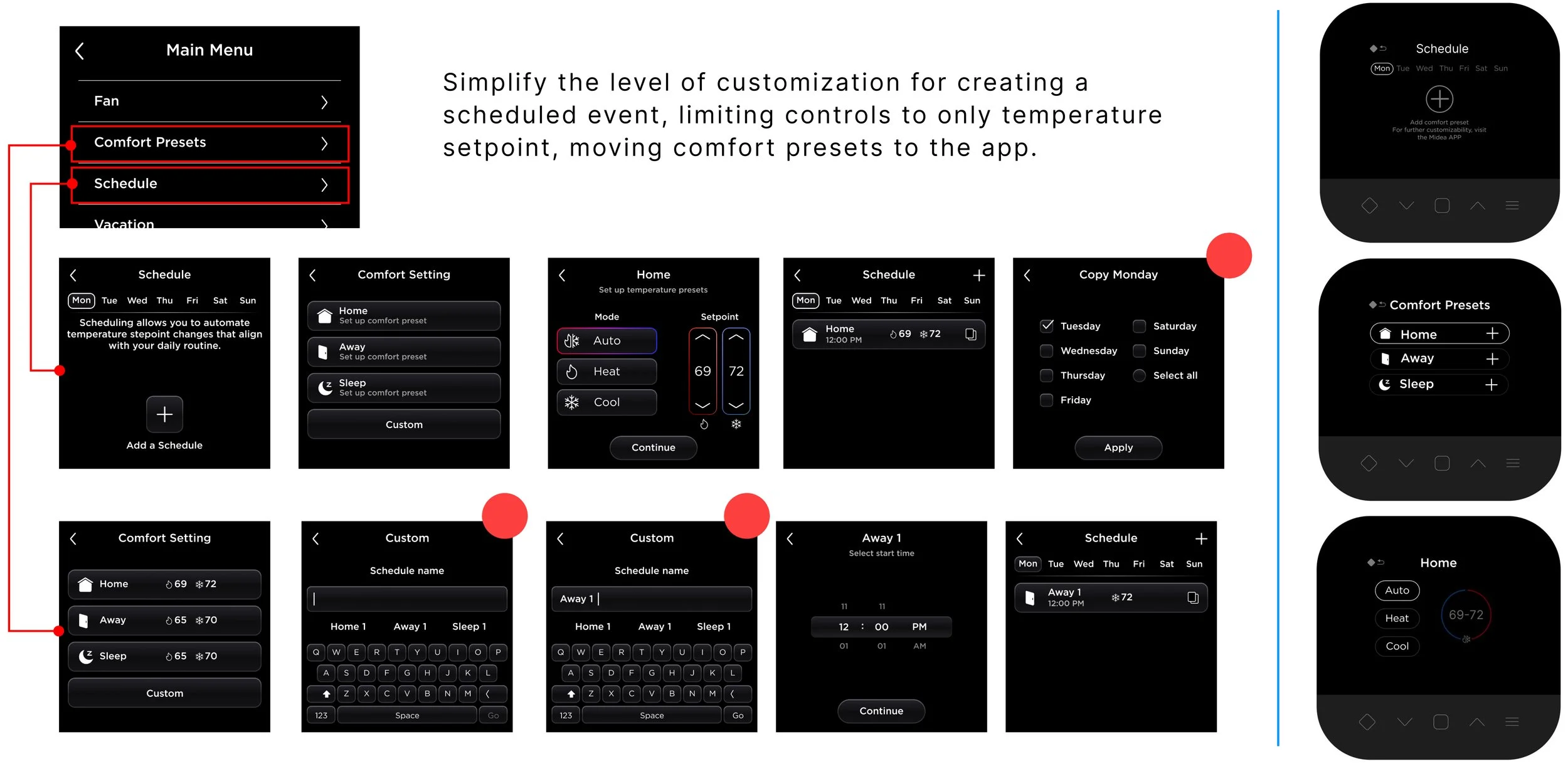 For example, creating a schedule requires selecting the day, a comfort preset, adjusting setpoints and a start time. To reduce complexity on the device, I limited the selection to existing comfort presets with adjustable temperature and start time, moving deeper customization to the app.