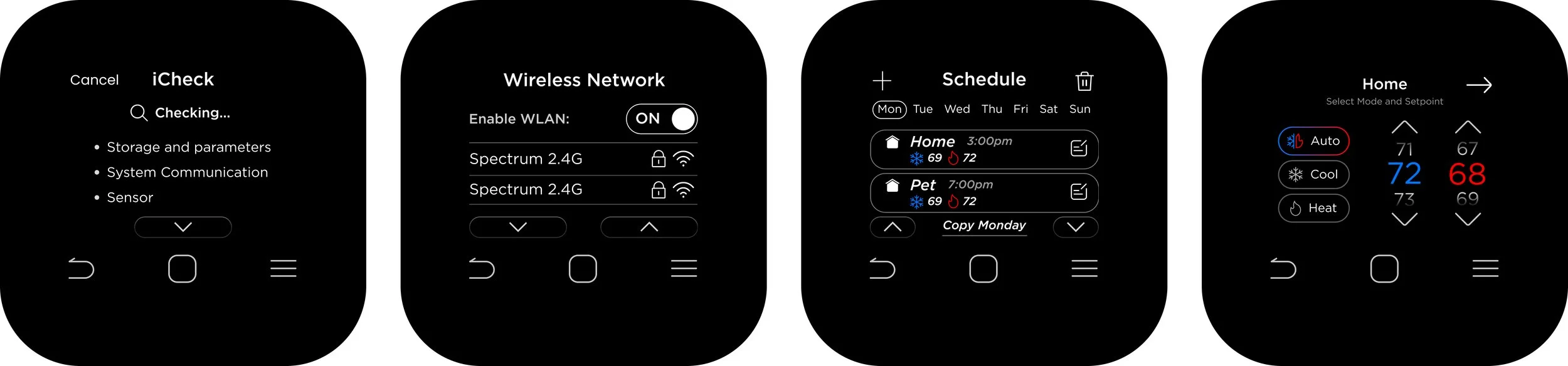 We also wanted to test the experience without capacitive buttons with the same touch screen specs. Overall, the fully touch screen interface was evidently more crowded for home screen and complex features such as schedule and vacation. It required the key content to compromise in proportion and size to make space for confirm and back buttons.